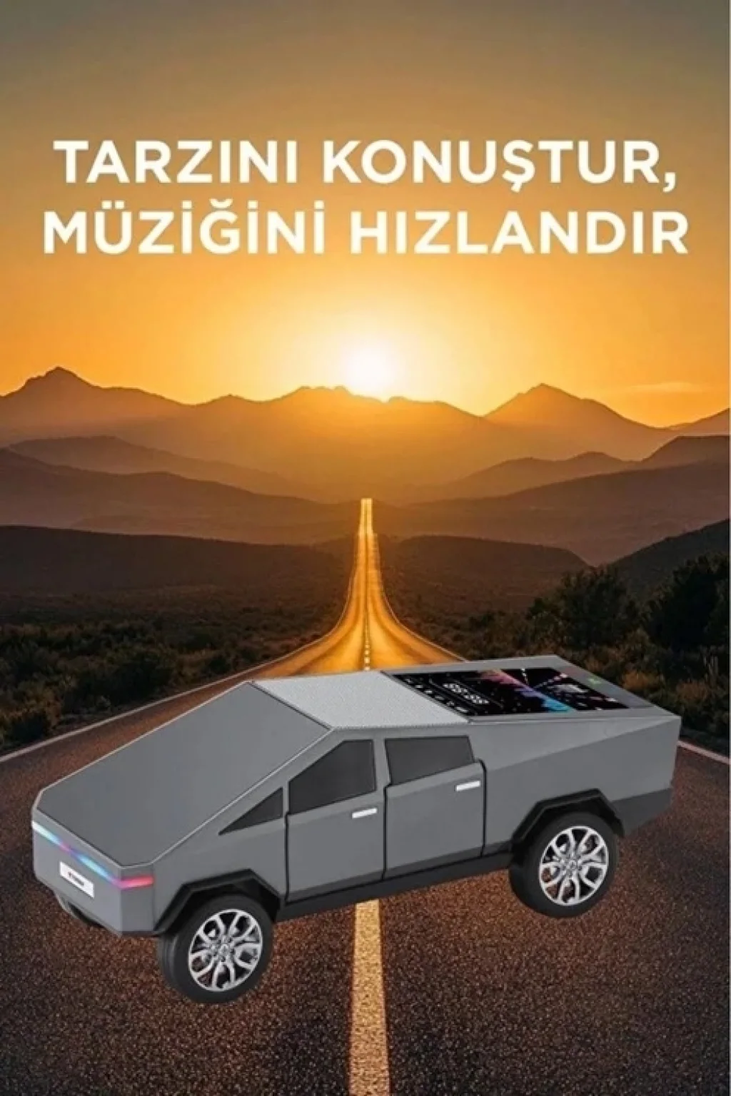 Araba Tasarımlı Bluetooth Hoparlör 15W Güçlü Ses RGB LED /TWS/USB kablosuz hoparlör ile müziğinizi yollara taşıyın Modern CyberTruck esintili tasarımıyla dikkat çeken bu hoparlör, sadece bir ses cihazı değil, aynı zamanda şık bir aksesuar.